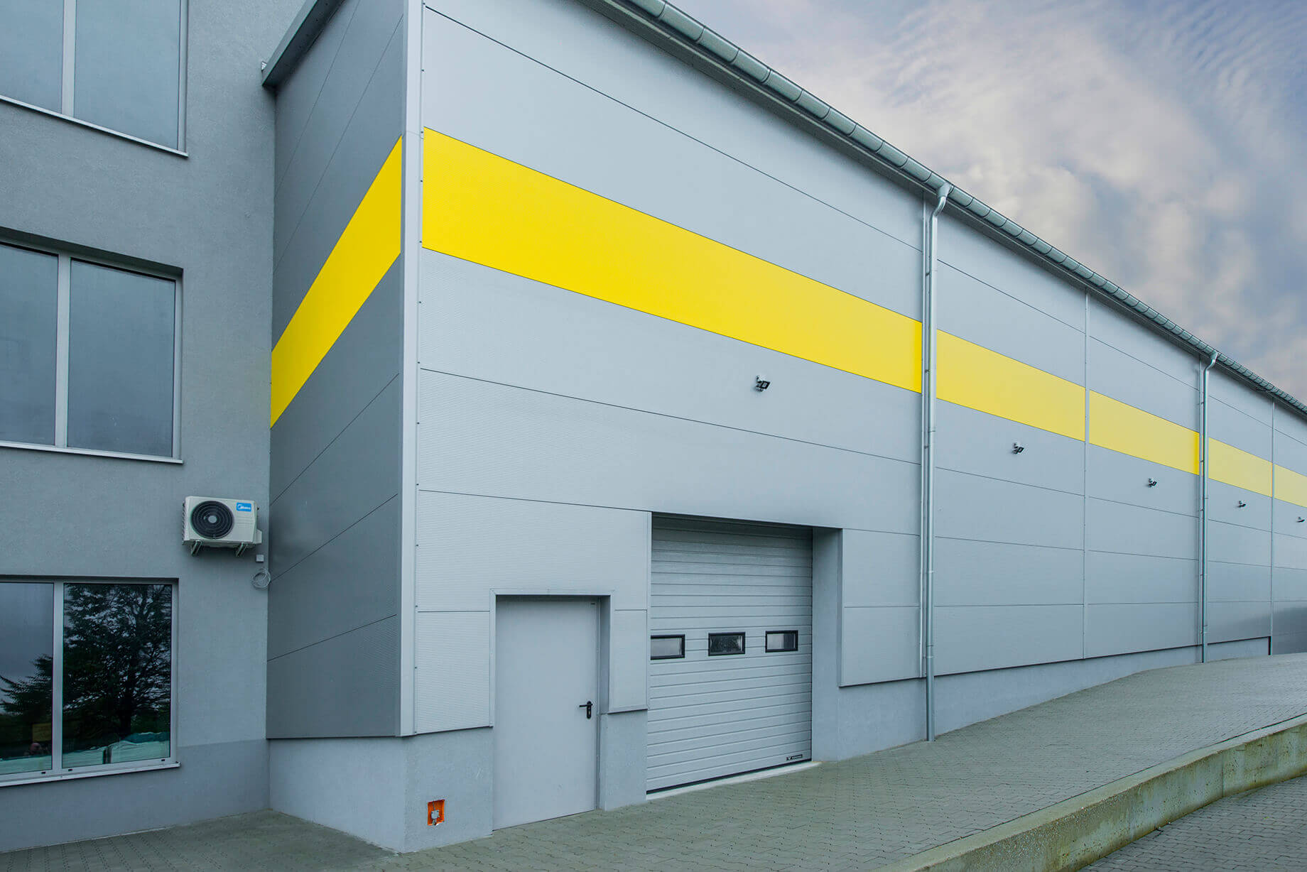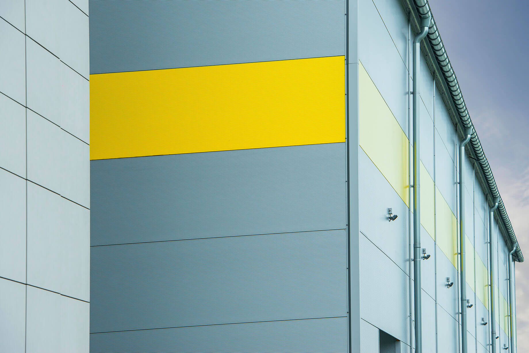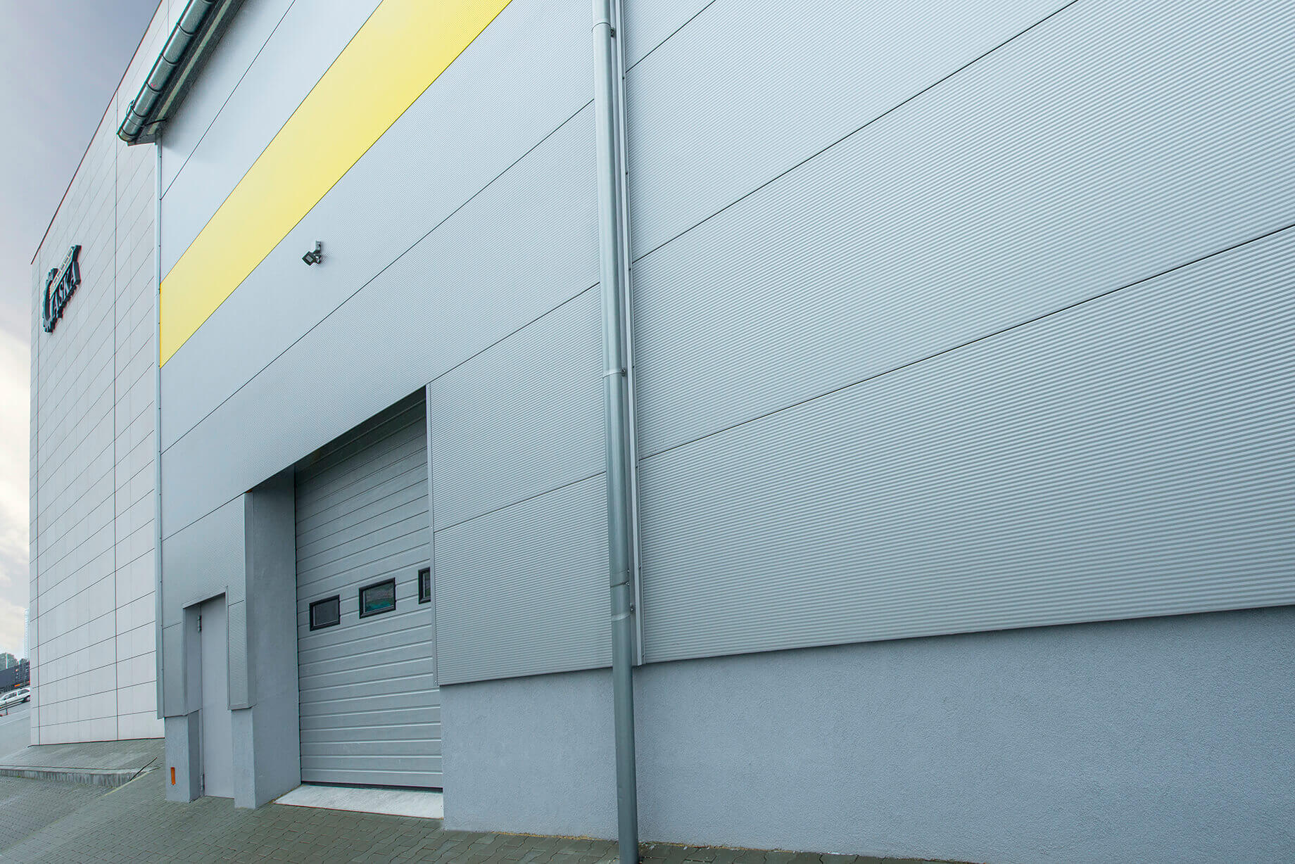 Покрівля будівлі виконана з панелей ARPANEL D PUR кольору RAL 9006 товщиною 120 мм і 100 мм, а фасад виконано з сендвіч-панелей із прихованою системою кріплення ARPANEL SU PIR товщиною 60 і 80 мм кольору RAL 9006 і стрічкою жовтого кольору RAL 1018.